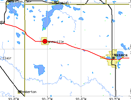 reproduced by the Waseca County Historical Society in 1976 http://www.historical.waseca.mn.us/waseca.htm In 1854, the present county of Waseca was a portion of that extensive region of the country known as Blue Earth county. Not a single white mate then had a habitation within its borders. By 20 February 1855, Steele county was formed then Waseca County was broken off on February 27, 1857. Its name is a Dakota word, which has been explained by Prof. A. W. Williamson as follows: "Waseca (wasecha),--rich, especially in provisions. I was informed in 1855 by a gentleman who was a stranger to me, who professed to be one of the first settlers, that this name was given in response to inquiries as to the Indian word for fertile, and adopted as a name. In Dakota writing and books the word waseca is spelled as we spell the name, and is a word likely to be given in answer to such a question. The soil is also very fertile." The name was first applied to the earliest farming settlement in 1855, near the present city of this name. http://mnplaces.mnhs.org/county.cfm At the meeting of the County Commissioners on 5 April 1858, the first separate township organizations were instituted. What is now Janesville was then name Okaman and given two polling places -- one at the house a A. Tuttle, near the north end of Lake Elysian, and the other near the south end of the lake, at the house of Caesar deRegan. On May 17, 1858, received the earlier name of its village -- Janesville. Old Janesville, the original village, on the west side of Lake Elysian, was called Empire, but an addition was platted in 1856 by J. W. Hosmer, who "named it Jane for Mrs. Jane Sprague, and then, by general consent of the villagers, the 'Jane' was enlarged by adding to it 'ville,' and Janesville resulted and was accepted as the name of the whole village" (Stennett, Place Names of the Chicago and Northwestern Railways, 1908, p. 87). During the winter of 1869-70 nearly all the buildings of the previous townsite were removed to the new railway village site, called East Janesville, platted in August 1869, for the Winona and St. Peter Railroad company. On May 10, 1870, the new village was incorporated as Janesville (History of Steele and Waseca Counties, pp. 616, 617, 622); the village was reincorporated on April 10, 1877. Old Janesville was also known as Ike Terill Trading Post when located in section 28. The post office was established in 1858. Among the first settlers was the Woolson family; son Albert Henry Woolson, who joined the army during the Civil War, was the last surviving member of the Union Army in the United States (born 1847 in New York and came to Minnesota in 1862, died in Duluth in 1956). Around 1870, the Koplen clan first settled near Alma City, which had been surveyed and platted by S. E. Stebbins in 1865 and had a hotel, stores, and a blacksmith shop. In 1905, Alma City was described as a "thriving village and the center of business for most of the people of Freedom (township) and a portion of the people of Alton (township). It has a thriving school and a successful creamery." |