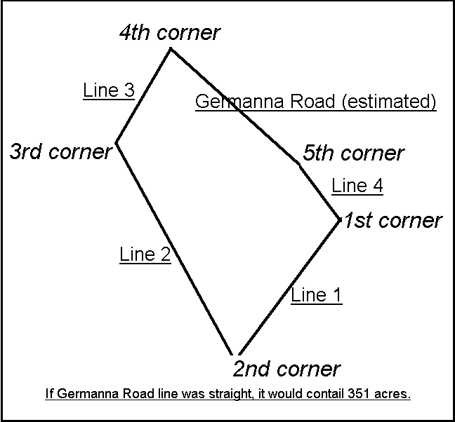 The land, as described in William Pemberton’s will: 1) South 54 degrees West 236 poles: that is from the first corner 54 degrees West of due South 236 poles or 1298 yards or 3894 feet to a second corner. This is a line running Northeast to Southwest about 3/4 of a mile. n 31 w 282 pole (Warner Patent Line) 2) North 31 degrees West 282 poles, that is from the second corner 31 degrees West of due North 282 poles or 1551 yards or 4653 feet to a third corner. This is a line running Southeast to Northwest about 9/10 of a mile. 3) n 29 1/2 E 152 pole: North 29.5 degrees East 151 poles, that is from the third corner 29.5 degrees East of due North 151 poles or 830.5 yards or 2491.5 feet to a fourth corner on Germanna Road. This is a line running Southwest to Northeast about 1/2 a mile. ?) curved line indicating Germanna Road, unmeasured or directed is indeterminate. 4) s 50 e 63 (this would intersect with N 29 if extended): South 50 degrees East 63 poles, that is from a fifth corner on Germanna Road 50 degrees East of due South 63 poles or 346.5 years or 1039.5 feet to the first corner at the beginning of 1) above. This is a line running Northwest to Southeast about 1/5 of a mile.